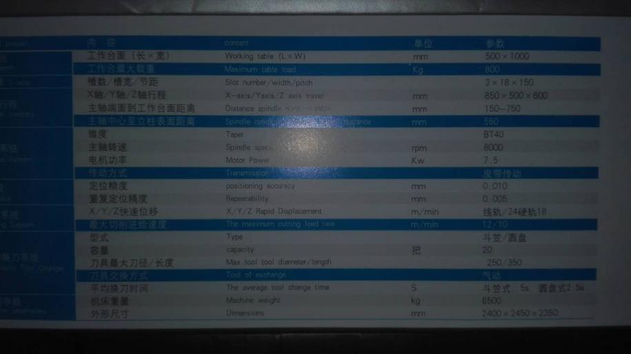 我們在宣傳產(chǎn)品時都會制作來一張表格來詳細介紹參數(shù)如下圖,下圖就是正工數(shù)控VMC850立式加工中心的參數(shù)表,我們根據(jù)這個表來分析立式加工中心的參數(shù)。我們把立式加工中心的參數(shù)分為了幾大部分,主軸參數(shù)、工作臺參數(shù)、行程參數(shù)、進給參數(shù)、精度參數(shù)、刀具參數(shù)還有其他的綜合參數(shù)。這張圖上面的參數(shù)全面的介紹了一款立式加工中心的所有數(shù)據(jù)。這也是顧客在購買加工中心時主要關注的產(chǎn)品數(shù)據(jù)。