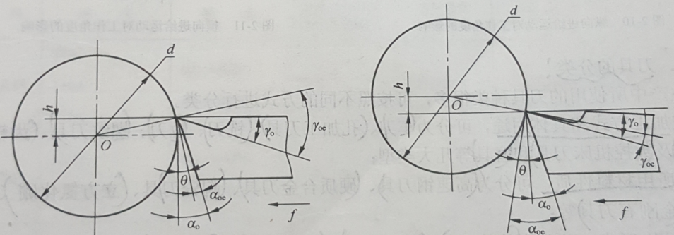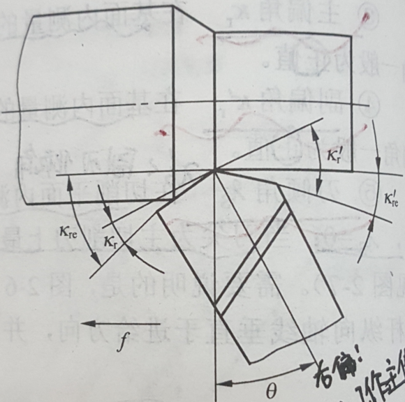 以上圖數(shù)控車床車刀車外圓為例,若不考慮進(jìn)給運(yùn)動,當(dāng)?shù)都獍惭b得高于或低于工件軸線時,刀具的工作前角roe和工作后角aoe,如圖a和圖b所示,當(dāng)車刀刀桿的縱向軸線與進(jìn)給方向不垂直時,刀具的工作主偏角kre和工作副偏角k′re,【如下圖所示】